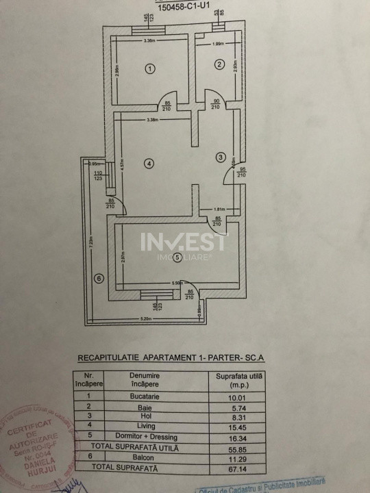 Imobilul este mobilat si utilat complet avand o suprafata de 55.85 mp utili plus un balcon spatios de 11 mp. Suprafata utila totala este de 67 mp.