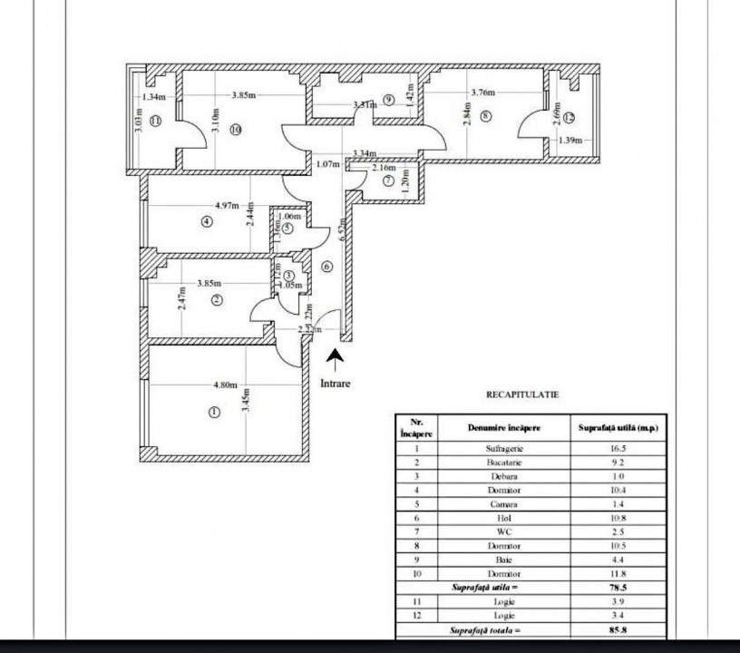 Imobilul are o suprafata utila de 79 mp, acesta fiind alcatuit din 4 camere, 1 bucatarie, 2 bai, 1 debara, 1 camara, 2 balcoane.