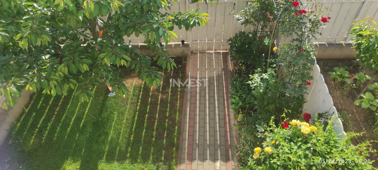 Grădină în fața casei amenajată cu flori, gazon și un cireș Grădină în spate cu zonă de relaxare, grătar, gazon și o mică grădină de legume – locul perfect pentru petrecerea timpului în aer liber .