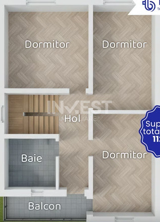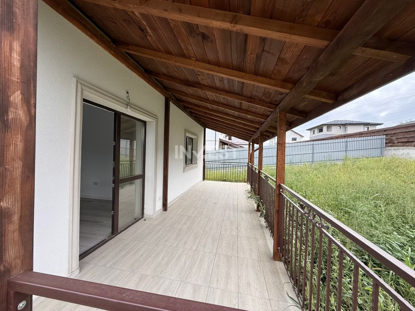 Locuința este organizată pe două niveluri: la parter găsiți un living spațios cu acces la o terasă generoasă, o bucătărie, un birou și o baie. Etajul oferă trei dormitoare, două băi și un balcon.