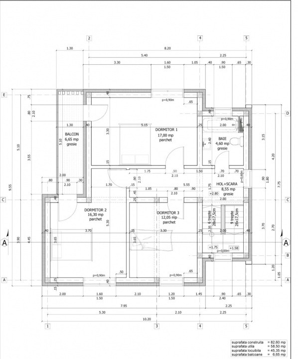 Etaj: 3 dormitoare, baie, hol, balcon