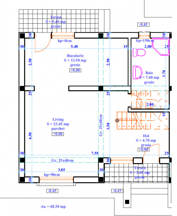 -Parter: hol acces, living, grup sanitar și bucătărie cu ieșire spre terasă și grădină.