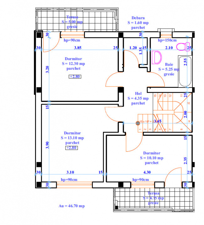 - Etaj 1: hol, 3 dormitoare, 2 balcoane, grup sanitar și debara/dressing.