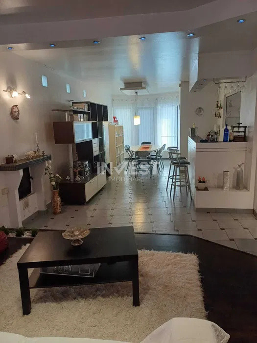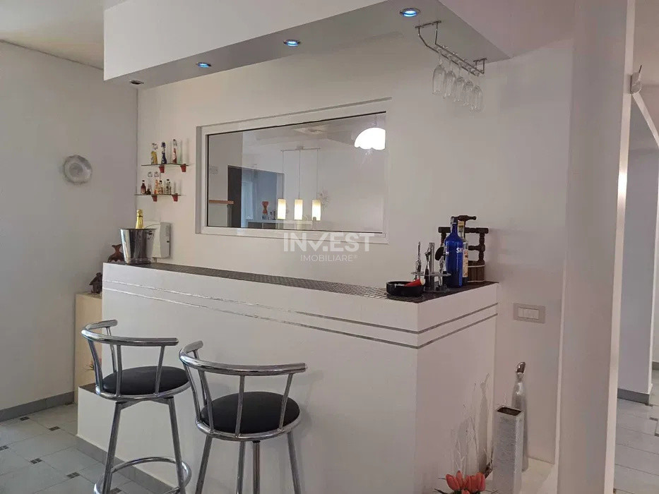 Parter: hol amplu, living open space cu șemineu, bar cu apă curentă, baie, bucătărie cu terasă acoperită (21 mp) și acces spre grădină.