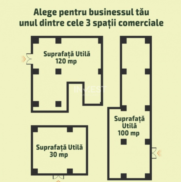Agentia Invest Imobiliare va propune spre inchiriere 3 spatii comerciale, situate la parter, in complexul Evergreen, perfecte pentru o sala de fitness, birouri sau cafenea.
